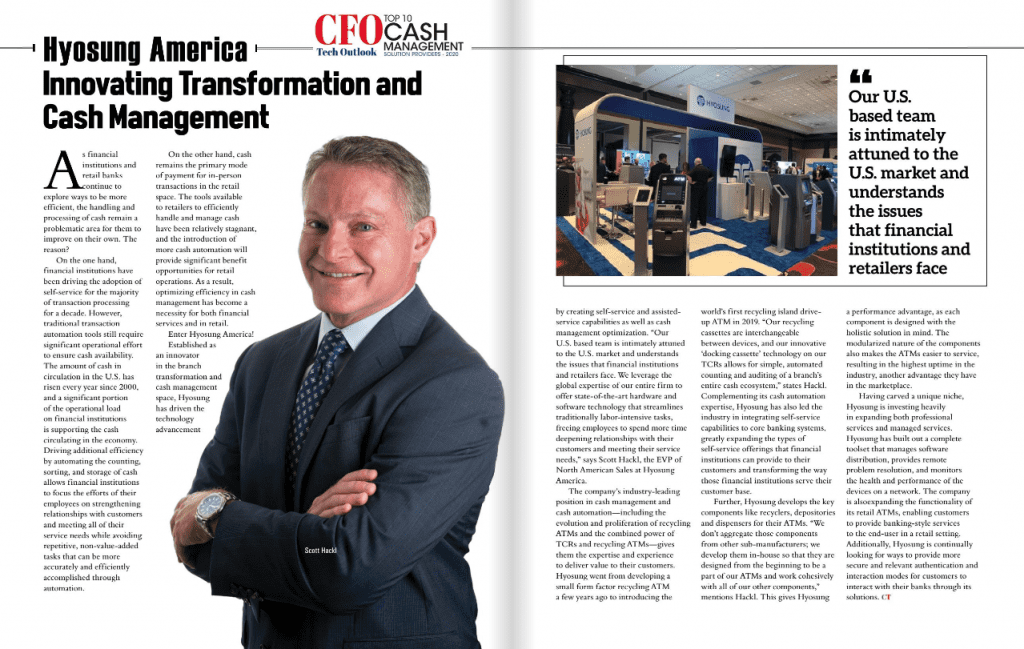 Established as an innovator in the branch transformation and cash management space, Hyosung has driven the technology advancement by creating self-service and assisted-service capabilities as well as cash management optimization.“Our U.S. based team is intimately attuned to the U.S. market and understands the issues that financial institutions and retailers face. We leverage the global expertise of our entire firm to offer state-of-the-art hardware and software technology that streamlines traditionally labor-intensive tasks, freeing employees to spend more time deepening relationships with their customers and meeting their service needs,” says Scott Hackl, the EVP of North American Sales at Hyosung America.